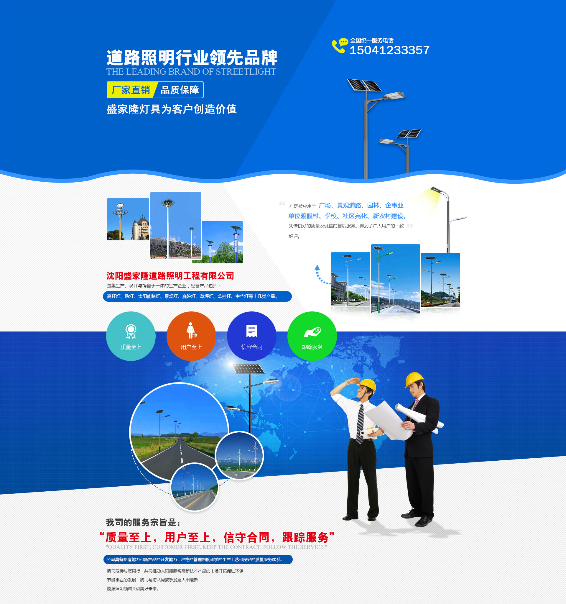 沈陽盛家隆道路照明工程有限公司坐落于沈陽市于洪區(qū)興盛村愛國,生產(chǎn)各種室外,道路,廣場,車站,碼頭,橋梁,庭院及室內(nèi)工礦照明燈具,品種有太陽能路燈,道路燈,LED路燈,組合燈,景觀燈,庭院燈,草坪燈,彩色泛光燈,中高桿燈以及配套使用的各種路燈頭,鎮(zhèn)流器,觸發(fā)器開關箱等系列產(chǎn)品。 本公司自成立以來,已初具規(guī)模,現(xiàn)有高級技術人員5人,中級技術人員28人,研究設計人員14人,車間工人百余人,并備有大型斬彎機,1600t-900t壓鑄機,20t行吊,高速縱剪機,埋弧自動焊,彩色噴塑線燈先進設備,高科技創(chuàng)造高質(zhì)量,由我公司生產(chǎn)的各種類型的照明燈具,不僅質(zhì)量可靠而且線條流暢,外形美觀,深受廣大客戶的喜愛,長期以來,我公司一直注重產(chǎn)品質(zhì)量,堅持“質(zhì)量是企業(yè)的生命”的宗旨。由于質(zhì)量可靠,價格合理,服務周到,從而贏得了廣泛的市場聲譽。企業(yè)先后被評為“質(zhì)量信得過企業(yè)”“重誠信守信用企業(yè)”,“AAA級資信企業(yè)”,并通過ISO9001:2000國際質(zhì)量體系認證,ISO14001:2004環(huán)境管理體系認證,CCC,CQC國家強制性產(chǎn)品認證和持有道路照明二級安裝,安全生產(chǎn)資質(zhì)。
